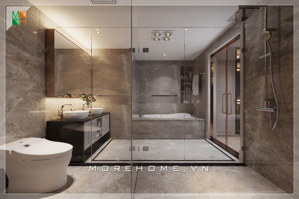 Phòng tắm biệt thự, nhà phố đẹp sang trọng sử dụng đá ốp lát cao cấp và kính ngăn hiện đại trẻ trung là không gian tuyệt vời, ấn tượng.