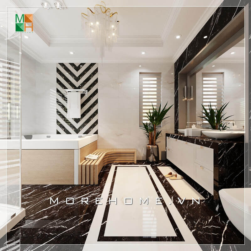 Sử dụng gạch lát nền màu đen và gạch ốp tường vân đá, sự kết hợp hài hòa giữa hai màu khiến căn phòng tắm trở nên sáng và rất sang trọng.