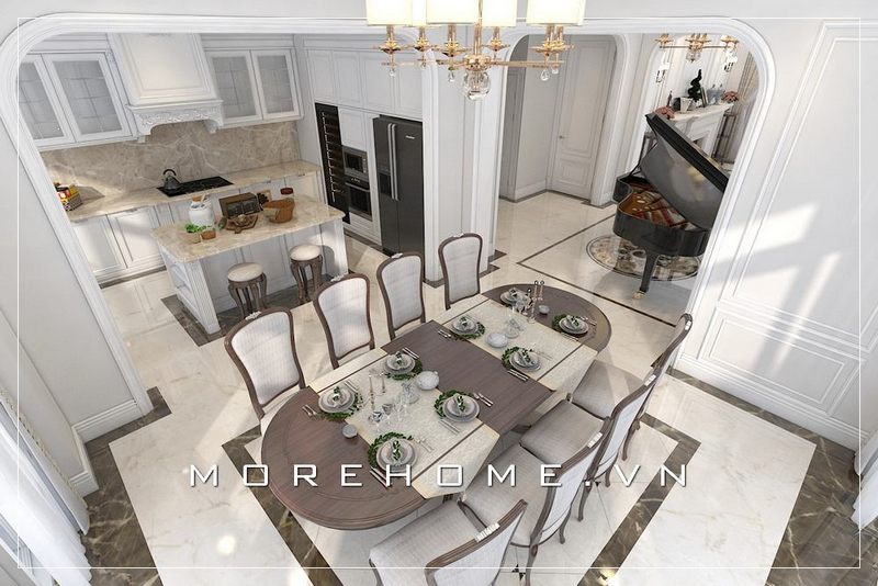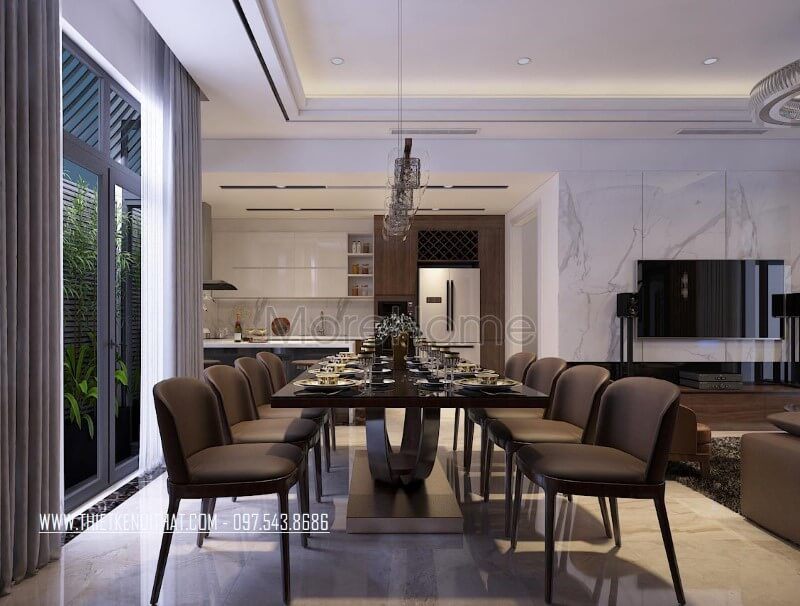 Phòng ăn biệt thự, nhà phố đặc biệt ấn tượng với tâm điểm là mẫu bàn ăn cao cấp hiện đại giữa một không gian sáng rộng mở.