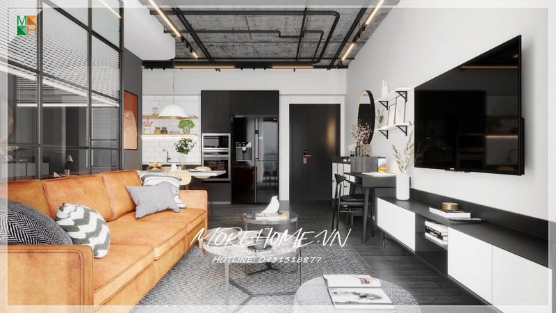 Thiết kế được sử dụng nhiều hai màu trắng đen tương phản từ kệ tủ đến cửa phòng, điểm nhấn cho phòng khách căn hộ hiện đại.