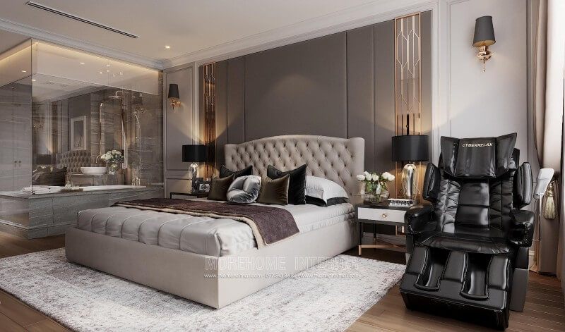 Thiết kế nội thất phòng ngủ biệt thự tân cổ điển sang trọng với sản phẩm giường ngủ gỗ óc chó, đầu giường bọc da cao cấp